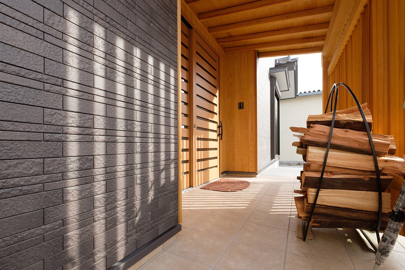 同属现代简约风的它,拥有两种不同宽度尺寸与多种面状细节,质地相当接近天然石材整体铺贴效果看似随意拼接,实则是不同尺寸间的规律拼接布局,整个墙体充满设计元素,凸显出和谐统一感起伏不一的面状与砖面饱满的颗粒感特别相衬,自然渐变的颜色更是点睛之笔,既抢眼又不失自然,呈现出色彩流动的生动感,也使整个墙面看起来更立体,能给整个装饰空间带来雅致的视觉感受。