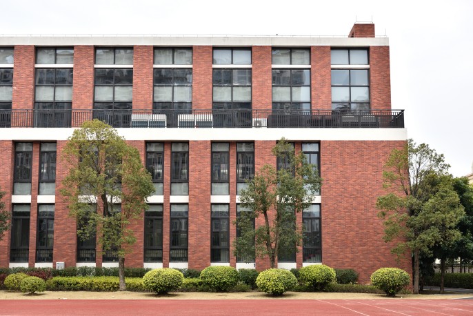阳光洒满校园,红色外墙砖愈发厚重明艳。复古的长条砖整齐排布,砖面的颗粒感在阳光下清晰可见,每一块砖都似藏着故事。