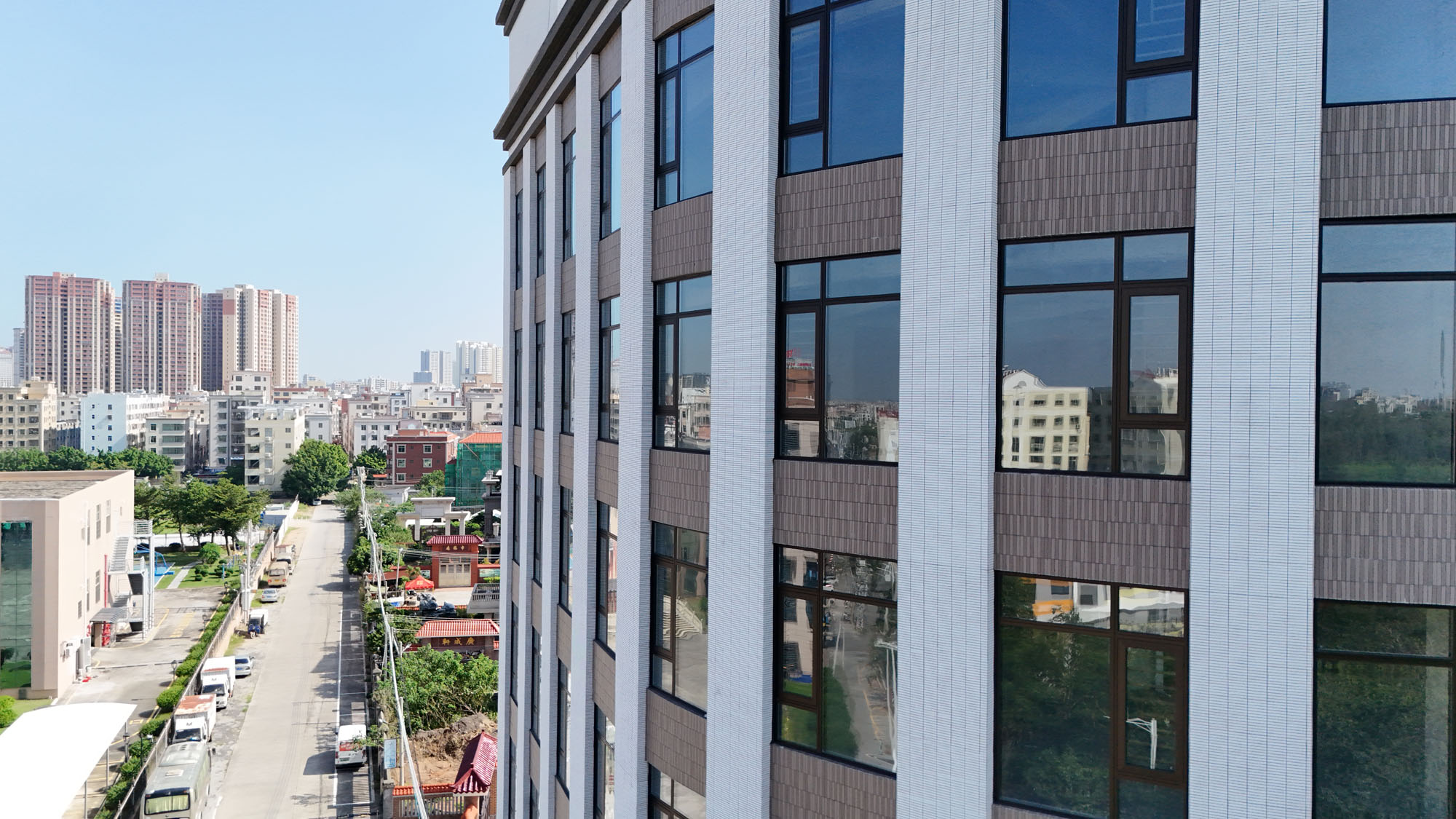 灰色外墙砖以沉稳的姿态嵌入其间,与白色砖条交错成景。浅灰如暮云淡抹,深灰似砚台轻研,同样的长条形制,却因色调的差异生出截然不同的质感。